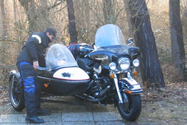 Der Plan stand fest. Merlin braucht einen dicken V2 und rechts daneben unbedingt einen Seitenwagen. Nach intensiver Internetrecherche hat Merlin in Villingen-Schwenningen das gefunden was er gesucht hat: Eine 84er FLH mit einem Ultraclassic. Nicht mehr ganz jung und in einem sehr vernachlässigtem Zustand. Aber die dicke Lady wurde mit vielen Ersatzteilen neu aufgebaut (eBay sei Dank), gehegt und gepflegt. Nun konnte man sich sogar damit auf die Straße wagen und Leute erschrecken. Besonders die Rückfahreinrichtung war bemerkenswert. Über das Seitenwagenrad wurde mittels eines elektronisch geregelten Anlassers die ganze Fuhre in Bewegung gesetzt. Das ist nicht weiter spektakulär, interessant ist die amerikanische Variante. Dort ist es Vorschrift, unabhängig von der Größe oder Räderanzahl, dass beim Rückwärtsfahren ein akustisches Signal, sprich Hupe, im Intervall darauf hinweisen muss, dass sich irgendwas rückwärts bewegt. Viele Leute haben oftmals sehr verdattert versucht die Lärmquelle zu orten.